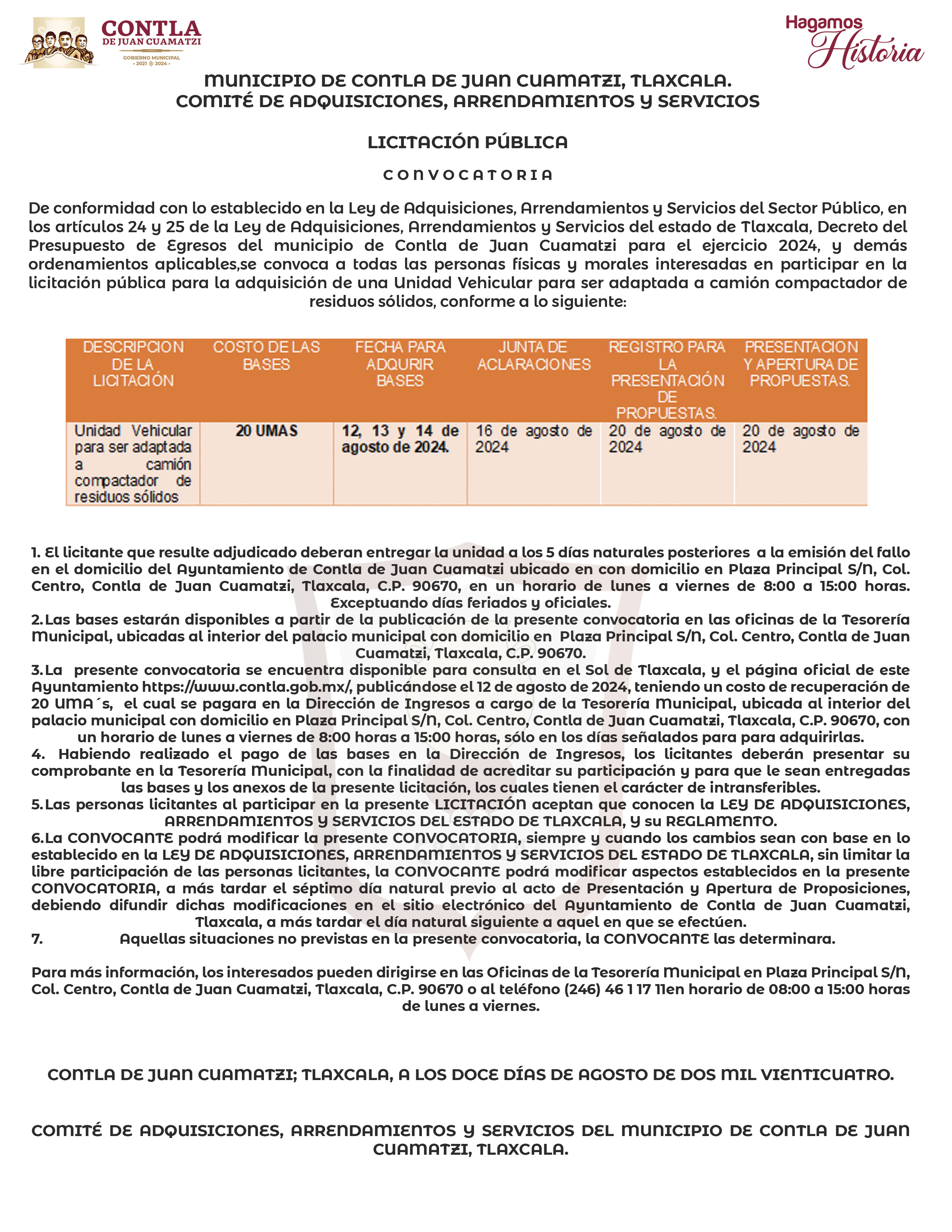 De conformidad con lo establecido en la Ley de Adquisiciones, Arrendamientos y Servicios del Sector Público, en los artículos 24 y 25 de la Ley de Adquisiciones, Arrendamientos y Servicios del estado de Tlaxcala, Decreto del Presupuesto de Egresos del municipio de Contla de Juan Cuamatzi para el ejercicio 2024, y demás ordenamientos aplicables,se convoca a todas las personas físicas y morales interesadas en participar en la licitación pública para la adquisición de una Unidad Vehicular para ser adaptada a camión compactador de residuos sólidos, conforme a lo siguiente: