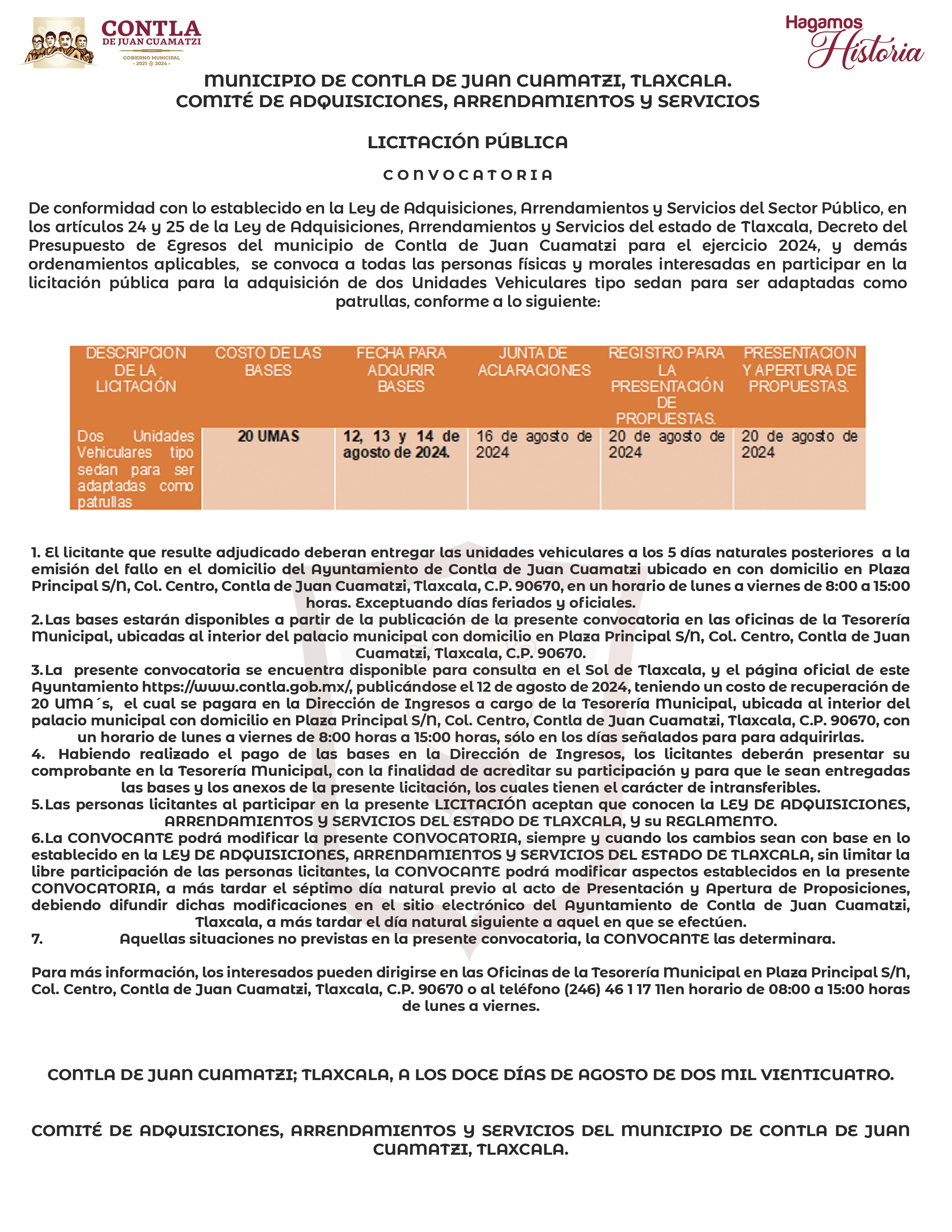 De conformidad con lo establecido en la Ley de Adquisiciones, Arrendamientos y Servicios del Sector Público, en los artículos 24 y 25 de la Ley de Adquisiciones, Arrendamientos y Servicios del estado de Tlaxcala, Decreto del Presupuesto de Egresos del municipio de Contla de Juan Cuamatzi para el ejercicio 2024, y demás ordenamientos aplicables, se convoca a todas las personas físicas y morales interesadas en participar en la licitación pública para la adquisición de Dos Unidades Vehiculares tipo Sedan para ser adaptadas como patrullas, conforme a lo siguiente: